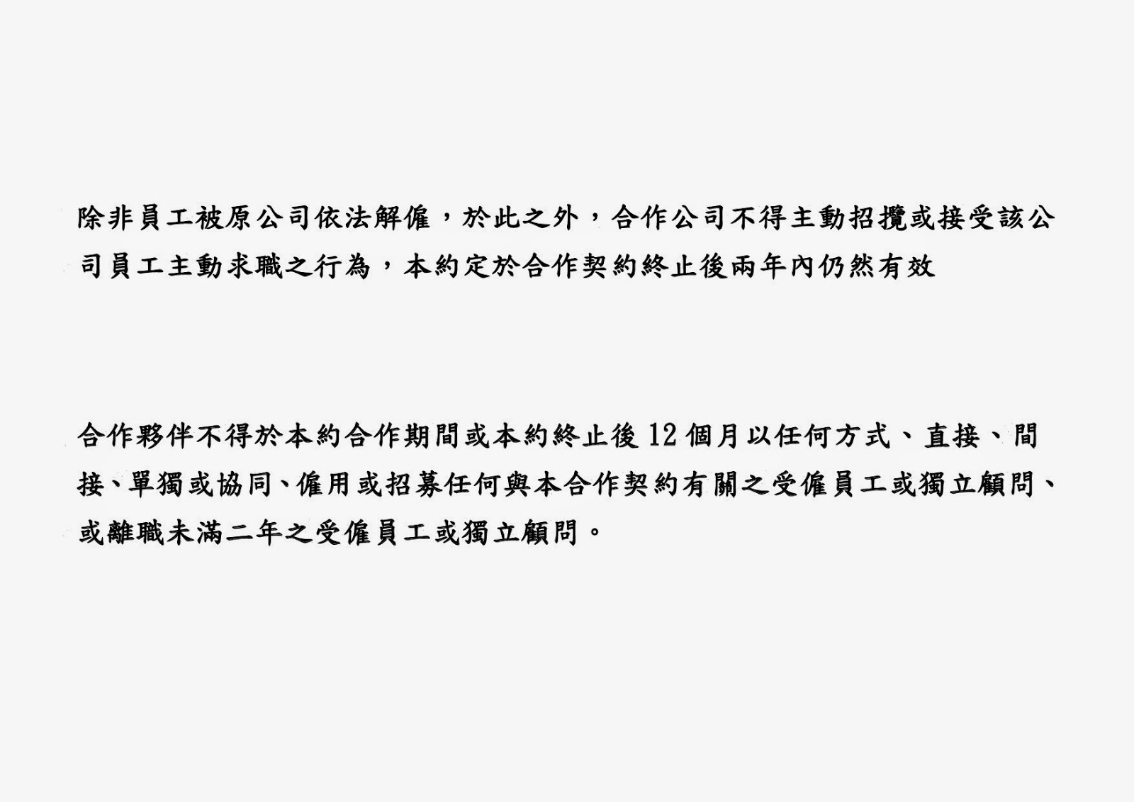 請記得禁止挖角條款適用範圍並不限於互相競爭之公司,如上圖的例子可以知道,上下游公司是合作關係,但也會有挖角的可能性,所以這個概念大家一定要有,一般約定的條文如下: